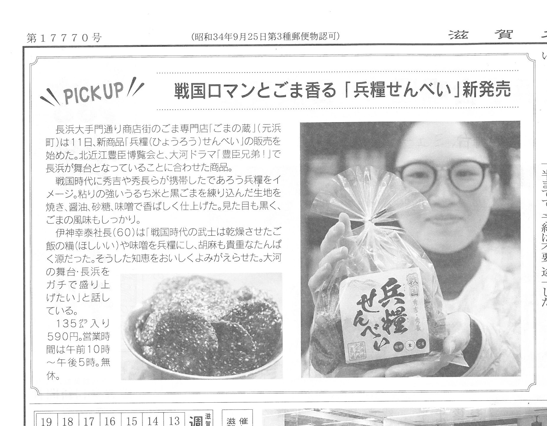 滋賀夕刊様に「兵糧せんべい」の取材内容を掲載していただきました!